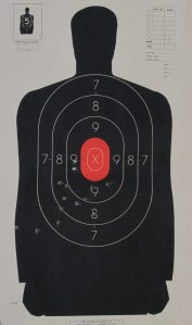 Right out the box I scored 14 out of 14 silhouette hits at 25 yards with the Glock. (Two magazines; I loaded each with only 7 rounds so I could haul the target back after each to see how I was doing.) A little low and to the left, but a nice tight shot group — not bad considering I had not fired a round in over 10 years.