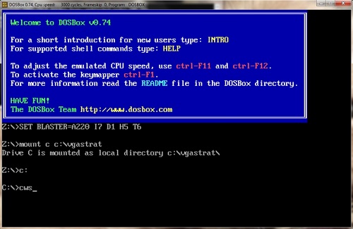 - Launch DOSBox, and at the DOS prompt, type mount c c:\vgastrat and press enter.