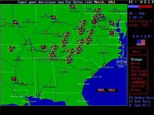 W.R. Hutsell’s VGA Civil War Strategy, a wonderful little MS-DOS gem, has been available as a free download for quite some time at Hutsell’s Games. The game’s no-nonsense graphics were a bit dated even when the game was first released, but completely adequate for the elegant point-to-point movement strategic wargame Mr. Hutsell laid underneath. The intuitive interface lets you jump right into and play without a lot of fuss, elaborate tutorials, or continuous references to a rulebook. Everything needed to cover the fundamentals of the American Civil War is present: armies and leaders with variable experience and supply, fortifications, rail and naval movement and naval invasions and commerce raiding. Interaction between all the game objects is well thought out; a lot of functional decomposition and design apparently took place long before coding began.