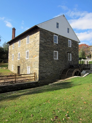 Another interesting landmark is Peirce Mill, which stands on property that was part of English land patents dating from 1747 to 1772. Isaac Peirce, a Pennsylvania Quaker living in Georgetown, acquired the pertinent portions in 1794, at which time there was already an undershot mill on the property. Peirce built the current structure in the 1820s, and upgraded it to a more efficient overshot mill in the 1840s. The mill’s internal machinery was changed several times over the years, but the Historic Registry entry (pdf) indicates the external appearance is almost unchanged from the 1820s, except for undocumented changes made by the Public Works Administration during the 1930s. There is another restoration in progress today.