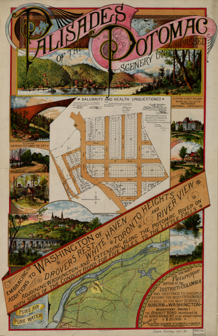 The “Palisades on the Potomac” poster is from the Library of Congress, American Memory. Photos of the Washington Psychoanalytic Institute and the Ough House are from The Palisades of Washington, Part 3, by Alice Fales Stewart. The photo of the old wagon road is from Google street view. All other photos are by the author. Notes on the locations are from Wikipedia and other sources as noted. The single most comprehensive narrative about the Palisades and the “Palisade on the Potomac” venture is the 2005 National Register of Historic Places application for Glen Hurst, available here in pdf format.