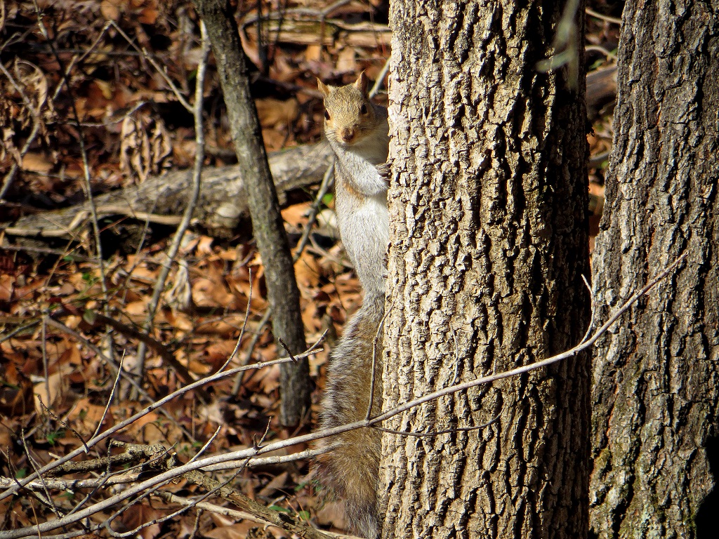 A squirrel taking cover
