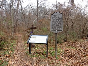From Fort Ethan Allen we walked northeast along Old Glebe and Military Roads, Randolph Street and a steep bike path to arrive at the historic marker that stands at the intersection of Pimmit Run and Potomac Heritage trails. A mill once stood near this point that played a part in the rescue of the Declaration of Independence and other historic documents when the British captured Washington DC during the War of 1812. On the day before the arrival of British troops in Washington in August 1814, the documents were smuggled across the river in a cart to the mill, and subsequently into hiding in Leesburg, Virginia, where they remained until the Washington area was once more secure.
