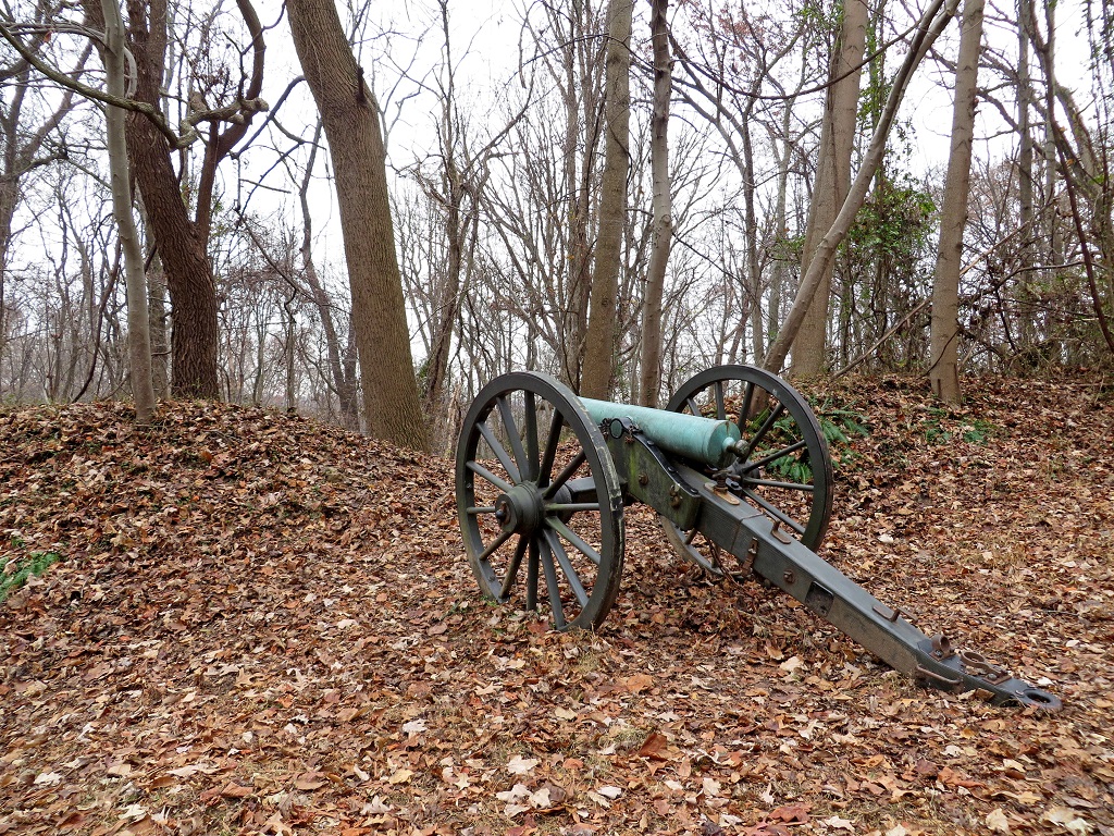 As I mentioned, I was able to cross over a few days earlier and snoop around in Fort Marcy, so here’s a little about the site. The works are actually quite well preserved, but trees make it pretty hard to visualize what the fort was like during the Civil War. As this photo from the Library of Congress shows, the area was almost completely cleared of trees during the Civil War to provide building materials for the fort, firewood, and to clear fields of fire for the fort’s 18 guns. None of the fort’s period armament remain today, but there are a couple of cannon placed there today to help give you an authentic feel. On a side note, the body of Vincent Foster, Deputy White House Counsel for President Bill Clinton, was found on July 20, 1993, on the berm in front of the cannon shown below, dead of an apparent suicide.