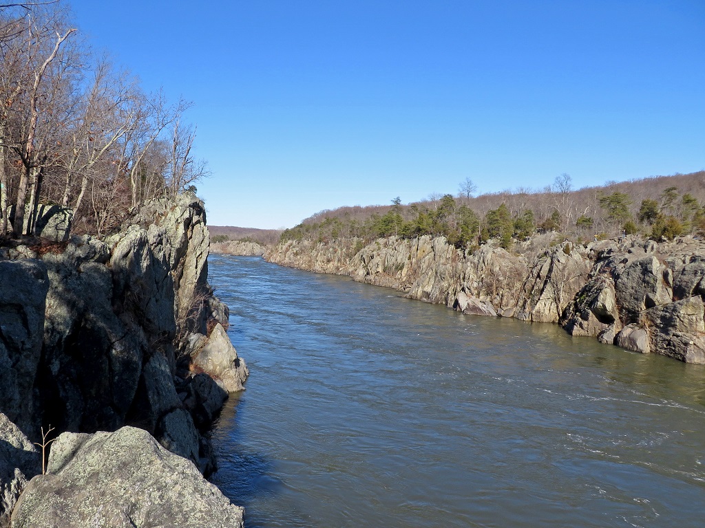 Mather Gorge, looking upstream. Note the hikers on the Billy Goat Trail, across the river on the Maryland side.