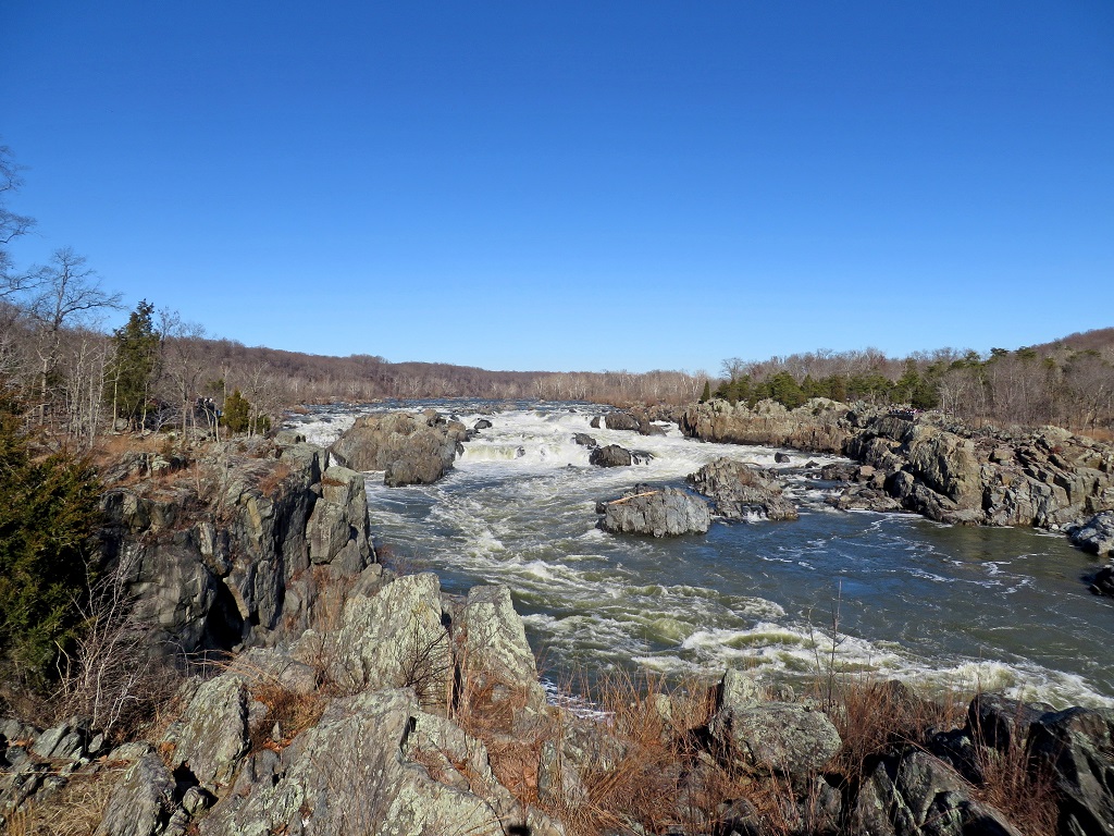 Mather Gorge, looking upstream. Note the hikers on the Billy Goat Trail, across the river on the Maryland side.