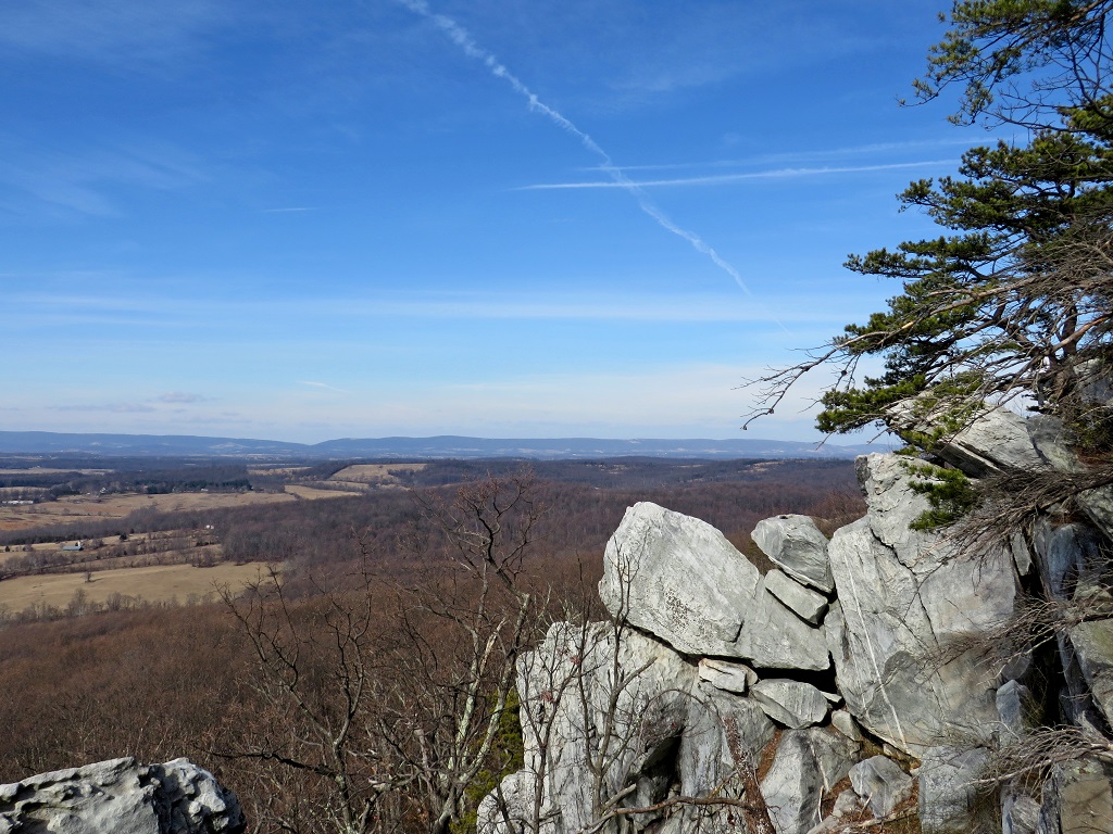 A beautiful sunny day, about 58 degrees, and a fantastic view westward from the sheer cliff at the summit! I think the impromptu hike probably turned out better than the planned hike would have!