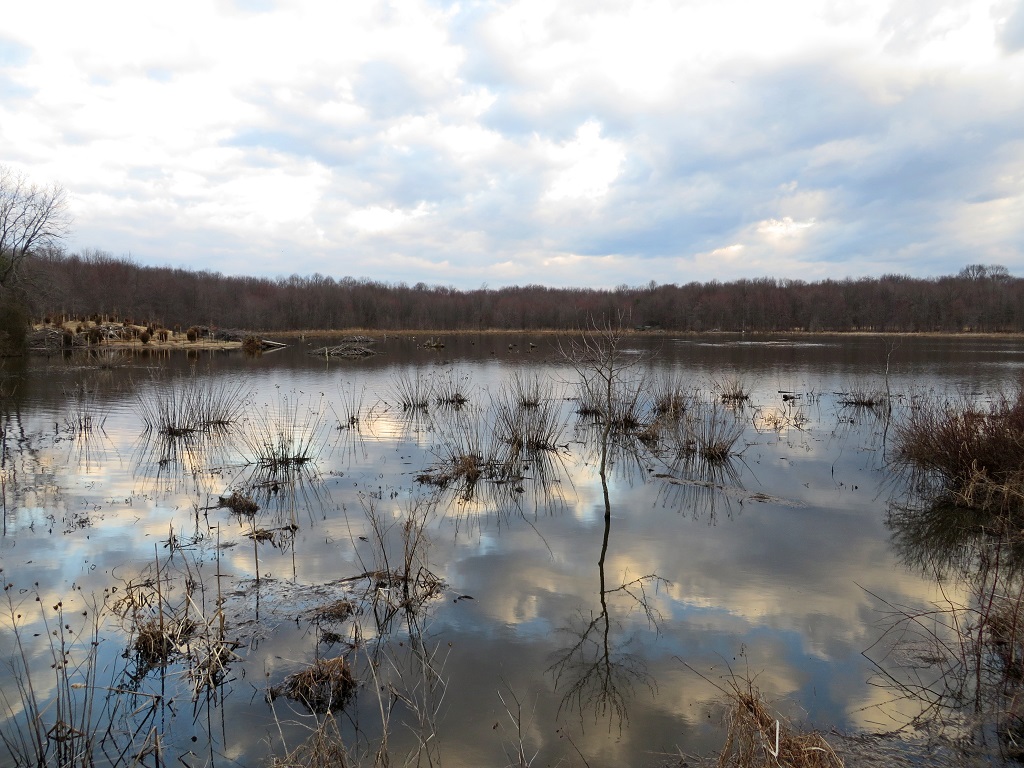 Clouds reflected on the central wetland. Theberm created by the restoration project is at left.