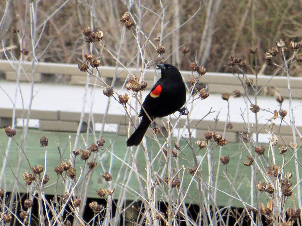 Two red-winged blackbirds preening by the boardwalk, with a male cardinal supervising.