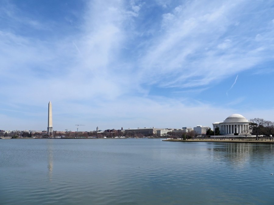 The Tidal Basin, with the Washington Monument and the Jefferson Memorial at left and right, respectively.