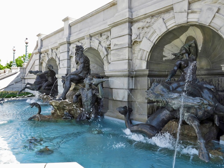 Designed by Ronald Hinton Perry in 1897-8. Neptune, the god of the seas, is flanked by the Tritons, his sons, and further to left and right are Nereids (sea nymphs).