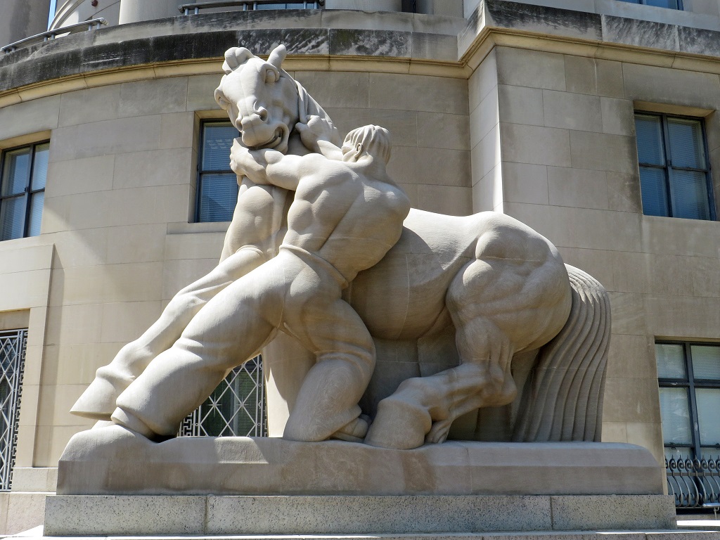 There are two of these equestrian statues at the Federal Trade Commission, created by Michael Lantz in 1942. They have a blocky, cartoonish style reminiscent of New Deal or Soviet propaganda. (But I repeat myself.) No free trade in this vision, certainly.
