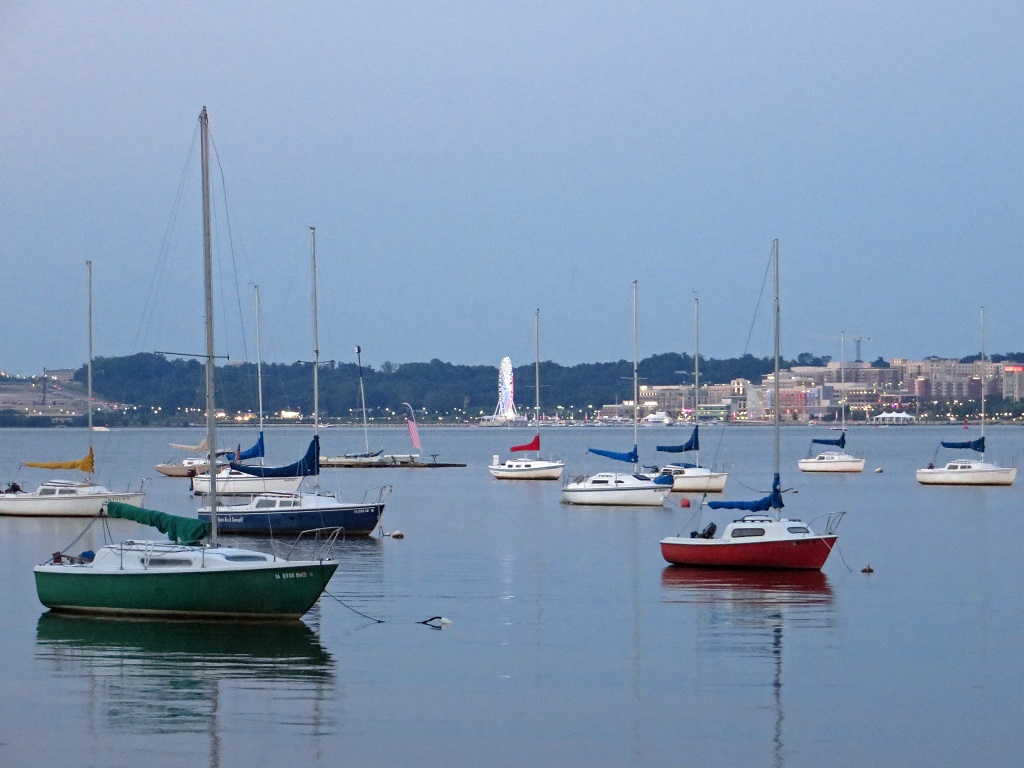 Sailboats at Belle Haven Marina, with the new ferris wheel at National Harbor in the distance