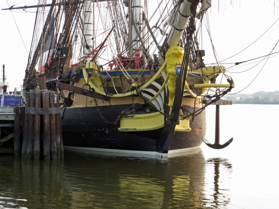 The lion figurehead on Hermione’s bow carries a coat of arms with the emblems of France (crown and fleur-de-lis).