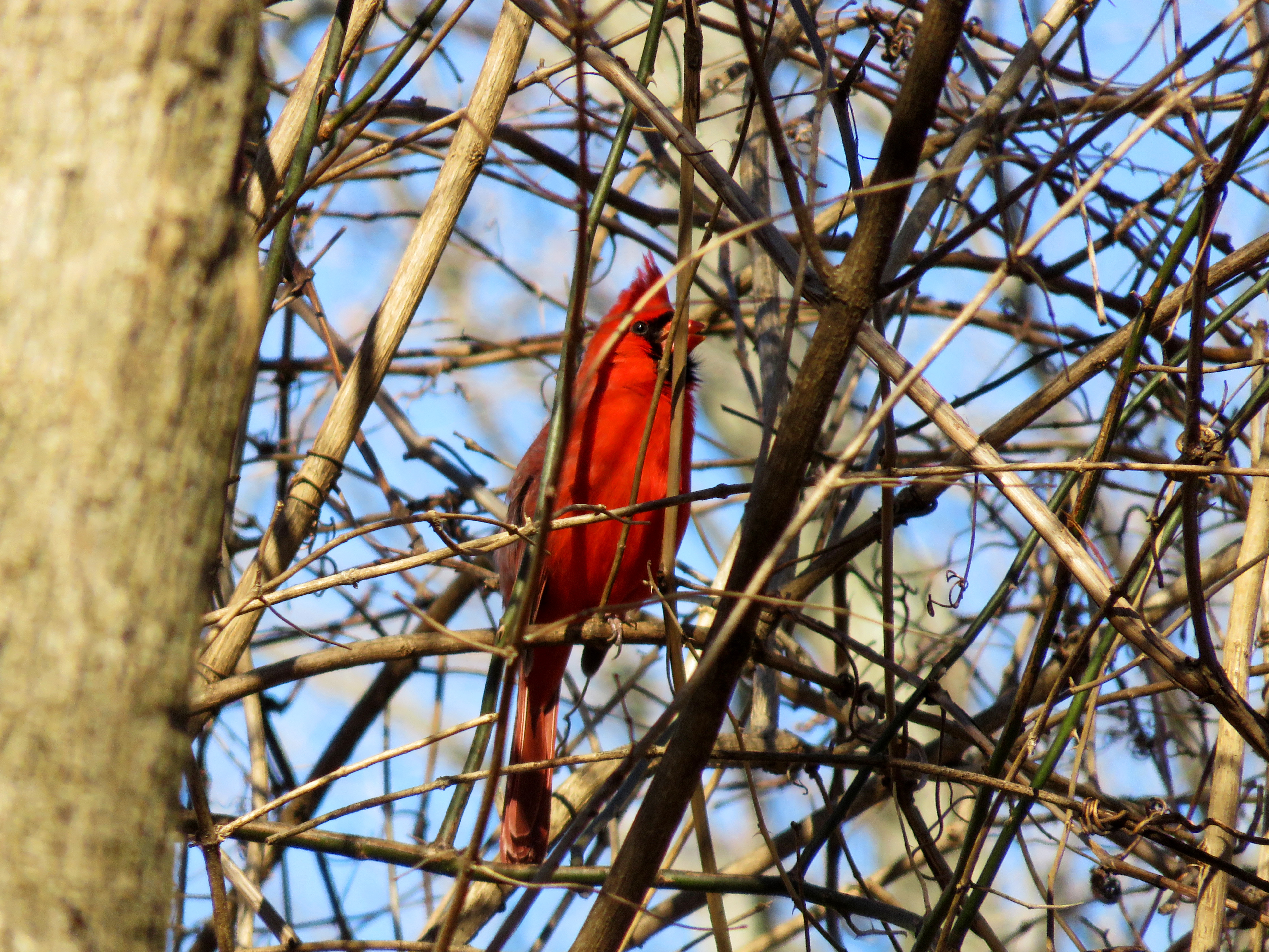 A cardinal singing contentedly in the security of brambles